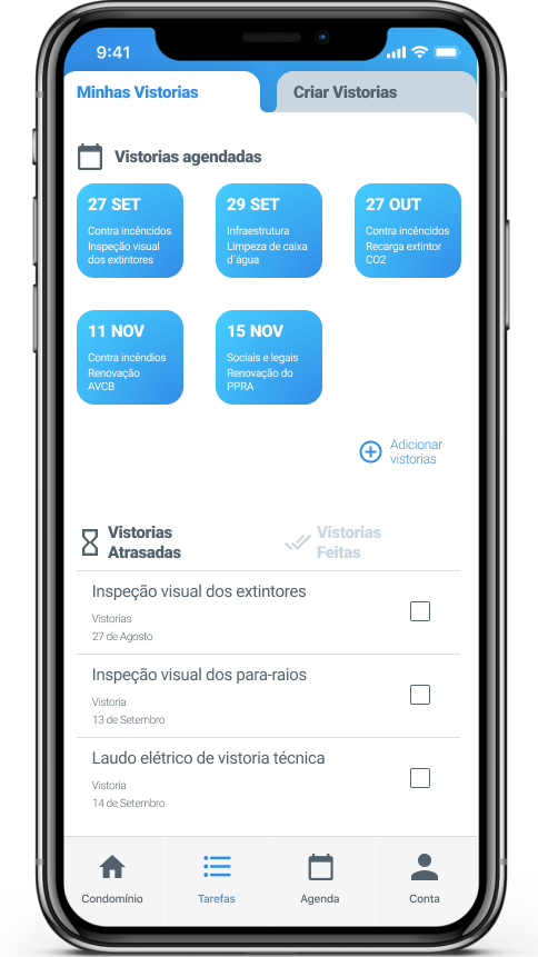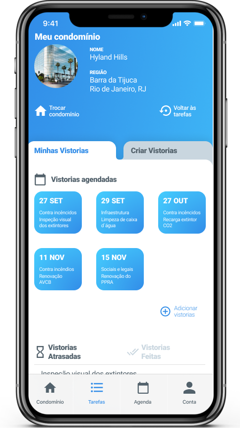 Com a SIX você tem o acompanhamento das suas vistorias atrasadas, recebendo alertas instantâneos que te dão o conforto necessário para o seu dia a dia como síndico. Além disso, consegue acompanhar o que já foi realizado e está em dia.