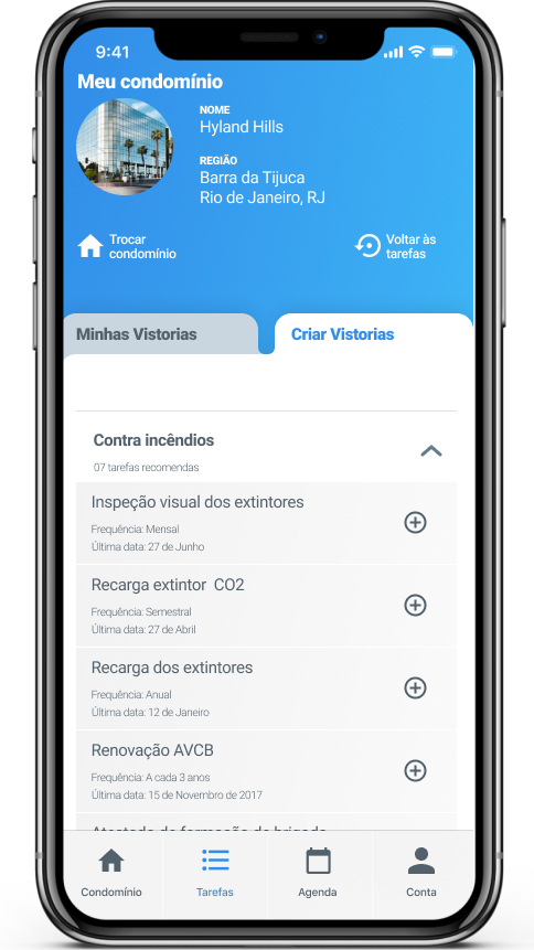 A plataforma é inteligente e, com base em algumas informações, consegue fornecer as tarefas necessárias para o seu dia a dia no condomínio. Para adicionar basta clicar na atividade e selecionar a data da última realização. E, se quiser, pode até mesmo integrar a sua agenda pessoal. Deixa isso com a gente!